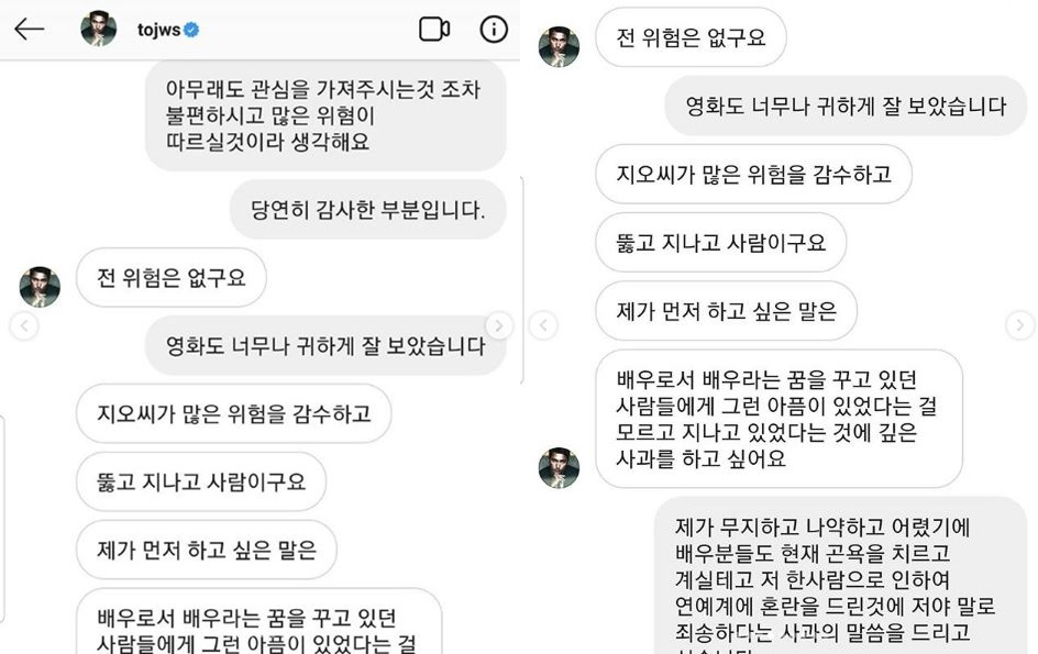 Yoon Ji Oh nói: “Tôi muốn bày tỏ lòng biết ơn từ tận trái tim đến diễn viên Jung Woo Sung vì sự quan tâm chân thành của anh ấy”. Nam diễn viên trả lời tin nhắn trước đó của cô: “Thưa cô Ji Oh, tôi định sẽ trả lời tin nhắn của bạn vào đầu giờ chiều nay, nhưng sau đó tôi không thể tìm thấy nó sau đó. Tôi đã lục lại thông qua Instagram, và bây giờ tôi lại thấy nó. Tôi nghĩ rằng có thể bạn đã xóa, nhưng có vẻ như đó là một vấn đề với tất cả các dịch vụ liên quan đến Facebook….”.