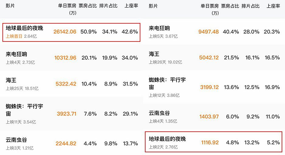 Trước khi Đêm cuối cùng của địa cầu được công chiếu, doanh thu phòng vé thu về ước tính đã đạt con số 159 triệu NDT (548 tỷ đồng), chỉ sau ba bộ phim là Truy lùng phố yêu 2, Thám tử phố tàu 2 và Ái tình công ngụ. Ngày đầu tiên lên sóng thì thành tích bộ phim thu được đã vượt qua 34% dự tính, tỷ suất chỗ ngồi là 42,6%, có thể xem là thành tích vô cùng tốt trước tất cả phim mới cùng chiếu.
