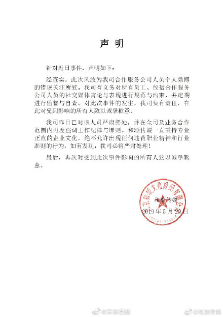 Ngay sau khi tin này được truyền ra thì phía truyền thông Hòa Tụng cũng đã lên tiếng trả lời, đăng bài thanh minh và buổi chiều ngày hôm nay. Trong bài thanh minh cho biết phía Hòa Tụng đã tiến hành xử phạt nghiêm khắc đối với nhân viên đó, đối với chuyện này cũng gửi lời xin lỗi thành khẩn đối với những người bị ảnh hưởng trong chuyện này.