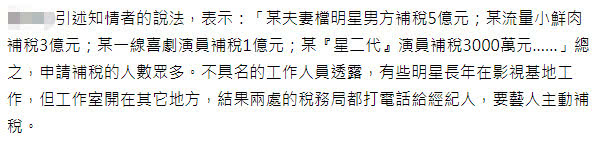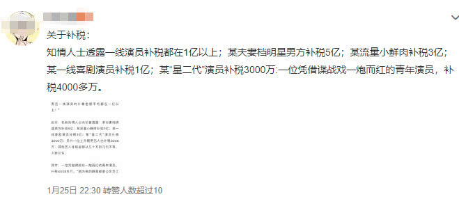 Nguồn tin này còn bổ sung rằng: “Có cặp vợ chồng nam diễn viên phải nộp bù 500 triệu NDT (1720 tỷ đồng), một tiểu thịt tươi lưu lượng nộp bù 300 triệu NDT (1000 tỷ đồng), một diễn viên hài hạng A nộp bù 100 triệu NDT...” Nói tóm lại, có rất nhiều người xin nộp bổ sung thuế.