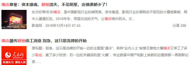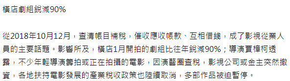 Kể từ tháng 10, tháng 12 năm 2018, thuế vụ trở thành chủ đề chính đối với những người làm việc trong ngành điện ảnh và truyền hình. Những bộ phim khởi quay của Hoành Điếm trong tháng 1 năm nay cũng giảm 90% so với mọi năm. Đạo diễn Giả Chương Kha tiết lộ rằng, có không ít bộ phim điện ảnh do các đạo diễn trẻ đang quay hoặc đang đợi quay, do vụ việc điều tra thuế của giới giải trí khiến công ty ảnh thị hoặc nhà đầu tư đột nhiên hủy bỏ khiến nhiều dự án bị bỏ dở giữa chừng.