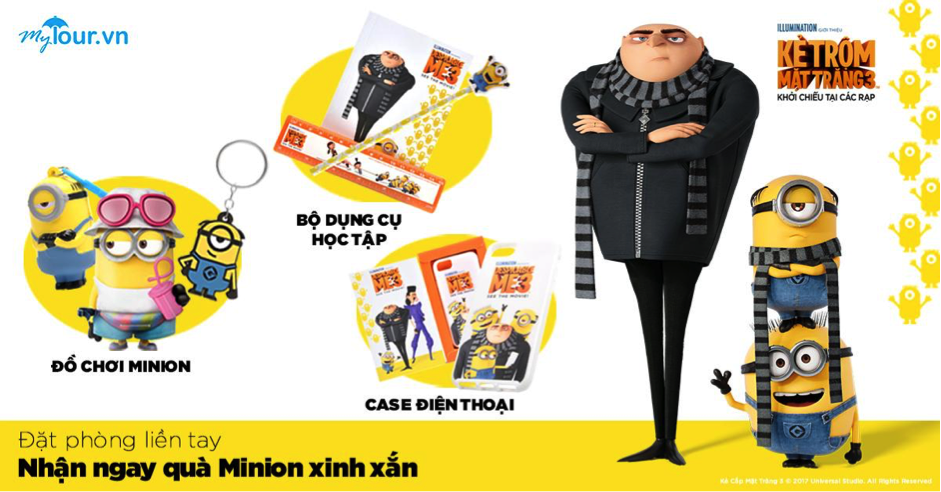 Sau bao chờ đợi, “Kẻ cắp mặt trăng 3 - Despicable Me 3” cũng sắp sửa ra mắt khán giả vào ngày 30/06/2017 tới đây. Chắc bạn chưa quên quân đoàn Minions “da vàng” đáng yêu lạc lối và cả gia đình Gru hài hước đâu nhỉ? Hè này, không chỉ được xem phim, bạn còn có dịp sở hữu những món quà “Kẻ cắp mặt trăng chất phát ngất” từ Mytour.vn nữa đấy. Mytour.vn đã hợp tác với hãng sản xuất “Kẻ cắp mặt trăng” mang về Việt Nam những món quà xinh xắn nhìn là thích mê dành tặng cho tất cả những ai may mắn.
