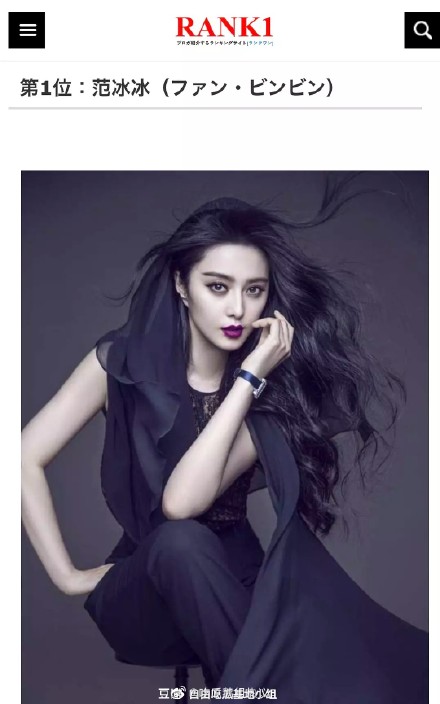 Đứng đầu trong bảng xếp hạng này thuộc về Phạm Gia - Phạm Băng Băng. Nàng đại hoa đán là một trong những cái tên đến từ Trung Quốc có độ quốc dân cao nhất nhì tại Nhật Bản. Vẻ đẹp của Phạm Băng Băng được dân mạng xứ Hoa Anh Đào được bình chọn là mỹ nhân đẹp nhất Trung Quốc, bất chấp “gu” thẩm mỹ ở nơi đây ưa chuộng theo lối dễ thương, ngọt ngào, hơi ngược với vẻ đẹp sắc sảo, mặn mà, quyền lực của Phạm Băng Băng. Mọi người yêu thích Phạm Băng Băng không chỉ khả năng diễn xuất của cô mà còn nhan sắc xinh đẹp ấy.
