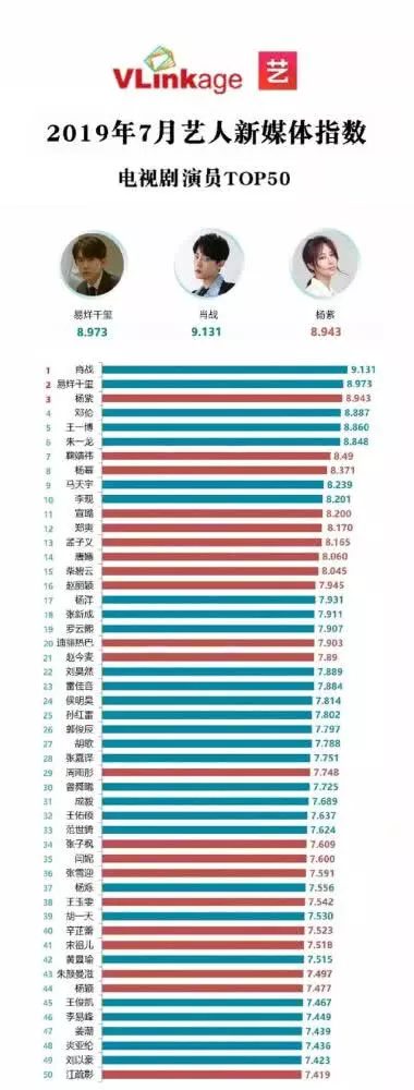 Ba người đứng đầu trong bảng xếp hạng chỉ số truyền thông tháng 7 gồm có Tiêu Chiến, Dịch Dương Thiên Tỉ và Dương Tử. Ra mắt trong tháng 7, Trần tình lệnh khiến khắp nơi phải dậy sóng vì sức nóng của mình. Tiêu Chiến - nam diễn viên chính của bộ phim chính là thỏi nam châm hút nhiệt của mùa hè tháng 7 năm nay.
