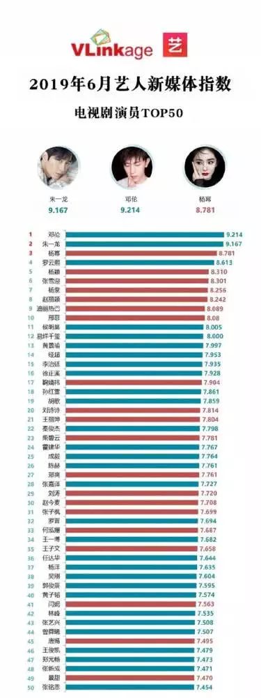 Ba người đứng đầu trong bảng xếp hạng chỉ số truyền thông tháng 6 gồm có Đặng Luân, Chu Nhất Long và Dương Mịch. Phim truyền hình Người bạn thực sự của tôi do Đặng Luân, Angelababy, Chu Nhất Long đảm nhận vai chính ra mắt, mặc dù rating của phim không phải rất cao nhưng lưu lượng, độ hot của Đặng Luân và Chu Nhất Long là điều không cần phải bàn cãi, nữ chính Angelababy xếp thứ 5 trong bảng xếp hạng này cũng không tệ.