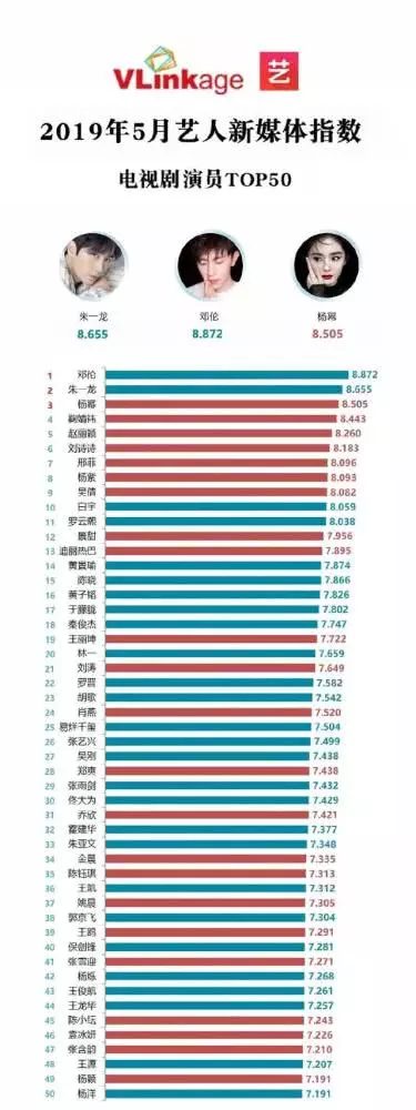 Ba người đứng đầu trong bảng xếp hạng chỉ số truyền thông tháng 5 gồm có Đặng Luân, Chu Nhất Long và Dương Mịch. Thành tích của tháng 5 và tháng 6 trong vị trí này đều như nhau.