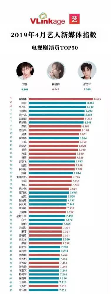 Tuy nhiên, dựa vào bảng xếp hạng này có thể nhận ra một điều top lưu lượng của minh tinh Hoa Ngữ thay đổi quá nhanh chóng trong năm nay: Từ đỉnh cao của Chu Nhất Long, Đặng Luân đang dần dần nhường chỗ lại cho Tiêu Chiến hay Dương Tử. Quả thật, cứ mỗi một tác phẩm sẽ đem đến vô số những bất ngờ và những cái tên mới tiềm năng trong làng giải trí.