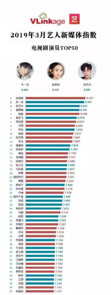 Ba người đứng đầu trong bảng xếp hạng chỉ số truyền thông tháng 3 gồm có Triệu Lệ Dĩnh, Chu Nhất Long và Trương Nghệ Hưng. Phim truyền hình Minh Lan truyện do Triệu Lệ Dĩnh, Phùng Thiệu Phong, Chu Nhất Long đảm nhận vai chính công chiều gần như chiếm hết quý đầu tiên vì có tổng cộng 78 tập.