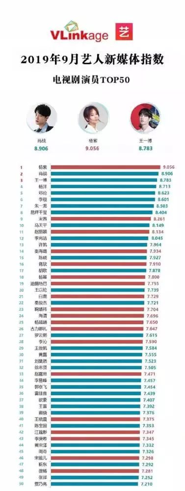 Ba người đứng đầu trong bảng xếp hạng chỉ số truyền thông tháng 9 gồm có Dương Tử, Tiêu Chiến và Vương Nhất Bác. Phim truyền hình Trần tình lệnh do Tiêu Chiến và Vương Nhất Bác đảm nhận vai chính đã kết thúc vào tháng 8 nhưng họ vẫn còn những tác phẩm đáng mong đợi phía trước như Dư sinh xin chỉ giáo nhiều hơn và Hữu phỉ - phim đang trong quá trình khởi quay. Trong khi đó, Dương Tử cũng có Chàng trai Mạc Cách Li của tôi ra mắt vào tháng 9 và một Dư sinh kết đôi cùng với Tiêu Chiến đang quay, ba minh tinh này đều được xem là đỉnh cấp lưu lượng hiện nay.