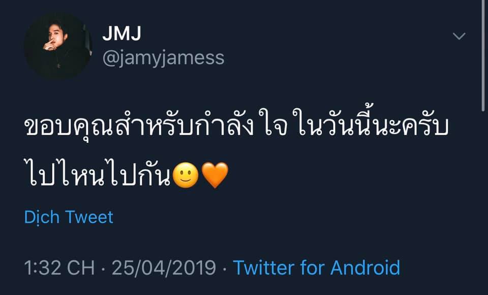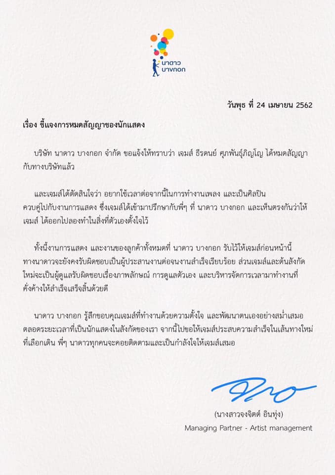 Nadao Bangkok cảm thấy rất biết ơn James vì đã làm việc rất nhiệt tình và không ngừng cải thiện bản thân trong suốt thời gian là diễn viên của chúng tôi. Từ bây giờ, xin chúc James thành công với con đường mà mình đã chọn. Các anh chị tại Nadao sẽ luôn theo dõi và ủng hộ James”