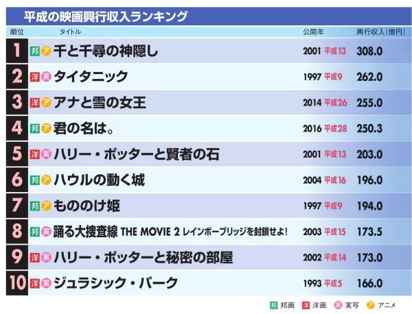 Phim điện ảnh ăn khách nhất thời Heisei là 千と千尋の神隠し - Spirited Away (thường được biết với tựa Việt là Vùng đất linh hồn) của Studio Ghibli. Tổng doanh thu của phim là 30,8 tỷ yên. Phim đã xuất sắc dành tượng vàng Oscar cho hạng mục Phim hoạt hình hay nhất năm 2003. Từ đó đến nay Nhật Bản chưa có đại diện nào lặp lại được lịch sử tương tự ở hạng mục này.