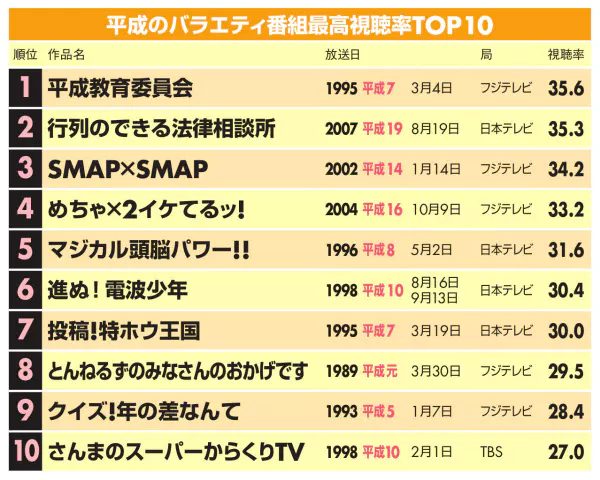 Variety show có rating cao nhất thời Heisei là 平成教育委員会 - Hei! Say! A Board of Education - Ban giáo dục Heisei số phát sóng ngày 4/3/1995 trên Fuji TV. Show này đã ngừng sản xuất và phát sóng vào năm 1997.