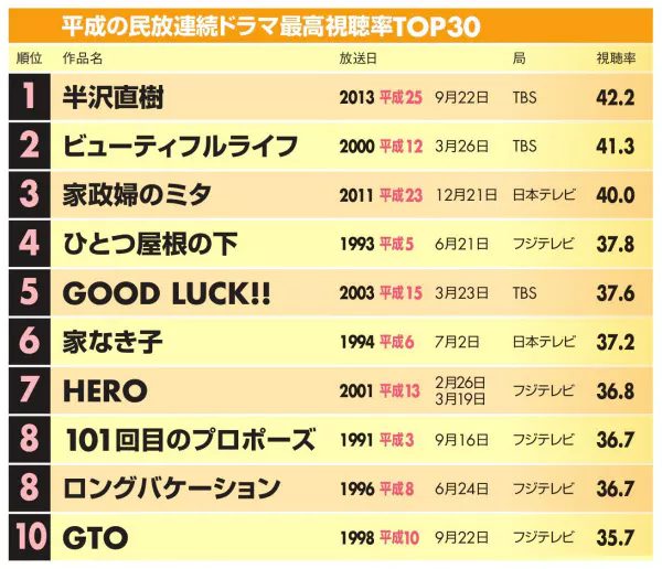 Đứng đầu trong top 30 phim truyền hình có rating cao nhất thời Heisei chính là bộ phim về ngành ngân hàng Hanzawa Naoki - 半沢直樹 tập cuối phát sóng ngày 22/9/2013 trên TBS. Điều đáng nói là phim chỉ mở đầu với rating 19,4% nhưng rating qua từng tập đã tăng chóng mặt và tập cuối đã đạt con số cao ngất ngưởng 42,2%. Không những vậy, phim còn gây sốt tại Đài Loan và Hong Kong qua đường xem lậu trên Internet trước khi được mua bản quyền phát sóng chính thức.