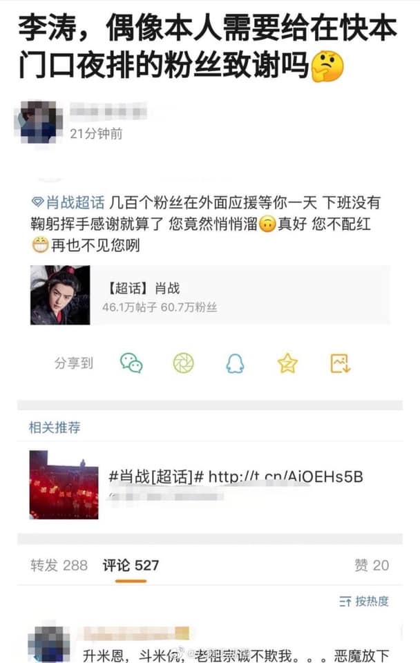 Chỉ mới gần đây, vào 7/9, trên một diễn đàn xã hội bỗng dưng có thông tin phản ánh gay gắt về thái độ của Tiêu Chiến đã gây ra một cuộc tranh cãi dữ dội. Theo như ý kiến của một fan hâm mộ thì sau khi quay xong chương trình Happy Camp, Tiêu Chiến đã không ra ngoài tương tác chào fan dù mọi người đã đội mưa để đến tiếp ứng. Chính vì thái độ đó của Tiêu Chiến nên bạn fan này cảm thấy vô cùng thất vọng và quyết định rời nhóm. Đó gần như là “tin xấu” duy nhất của anh sau khi “bạo hồng”!