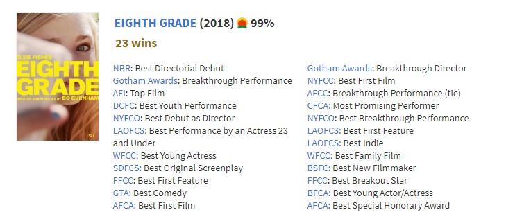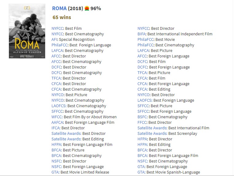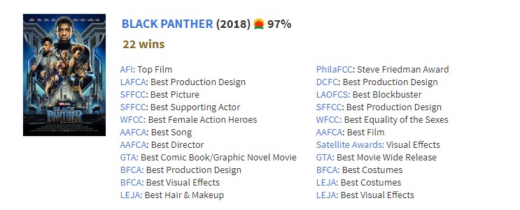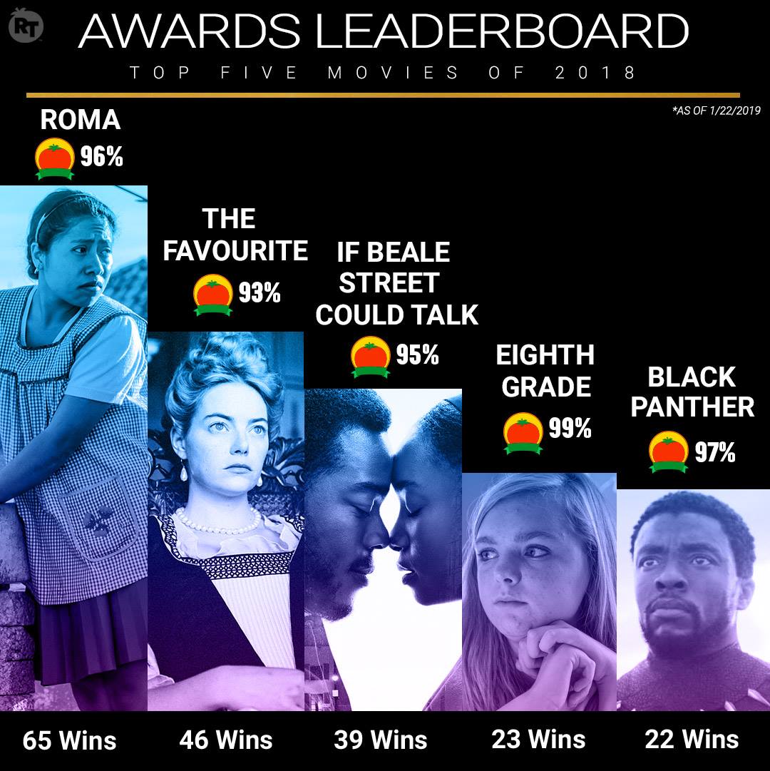Theo thống kê của trang Rotten Tomatoes, Black Panther đã có 22 chiến thắng tại những lễ trao giải lớn với điểm số trên trang là 97%. Các phim Roma, The Favourite, If Beale Street Could Talk, Eight Grade lần lượt có số chiến thắng là 65, 46, 39, 23.