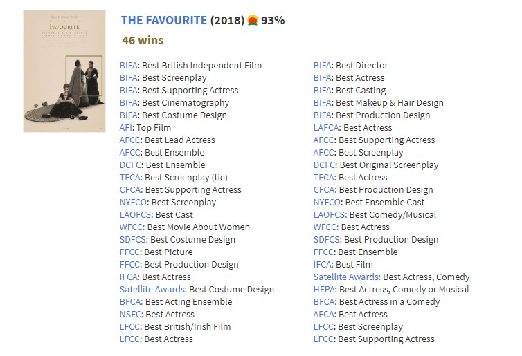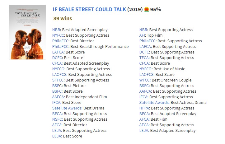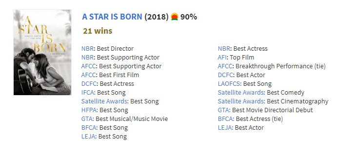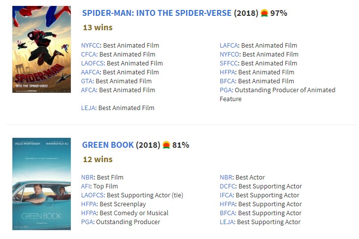 Theo sau đó, A Star Is Born có 20 chiến thắng, Green Book và Spiderman: Into The Spider-Verse có 13 chiến thắng.