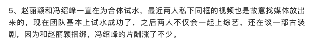 Mới đây, bogger tiết lộ Triệu Lệ Dĩnh và Phùng Thiệu Phong luôn muốn thử phản ứng, tranh luận của dân mạng khi cả hai xuất hiện chung nên video lần này là họ cố ý tìm truyền thông đăng tải lên. Cơ bản việc thăm dò cũng đã hoàn thành, sau này hai người không những sẽ cùng tham gia show, mà còn đang đàm phán quay một bộ phim cổ trang. Nhờ sự ràng buộc với Triệu Lệ Dĩnh mà thù lao của Phùng Thiệu Phong tăng lên không ít.
