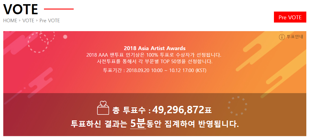Như vậy, sau 23 ngày mở cửa bình chọn cho Popularity Award - một trong những giải thưởng của sự kiện Asia Artist Awards (AAA) năm 2018, ban tổ chức đã thu về tổng cộng 49,296,872 phiếu. Dựa vào kết quả, chúng ta đã biết được chính xác chủ nhân thực sự của những giải thưởng danh giá này. Theo đó, nhóm nhạc nam BTS thắng giải trong hạng mục ca sĩ và Yoona của SNSD cùng Sehun của EXO trong hạng mục diễn viên.
