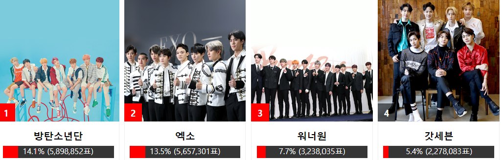 BTS nhận được 5,898,852 phiếu và chiếm 14.1%.