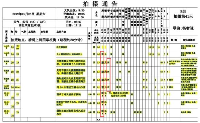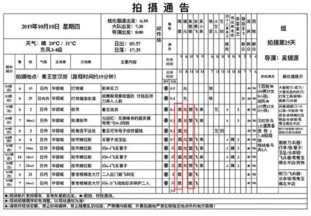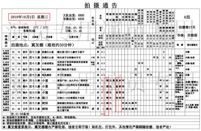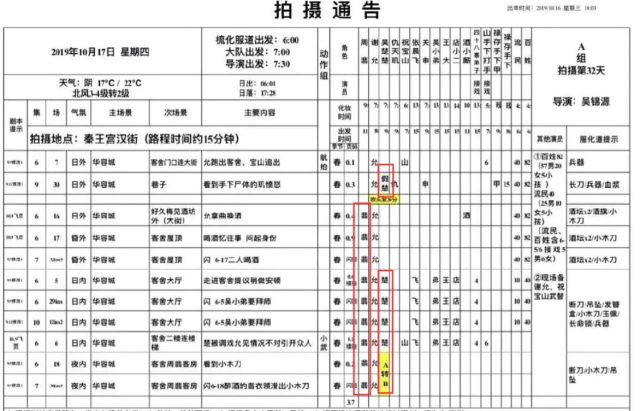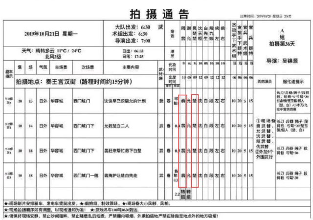 Ngày 17 tháng 10, Triệu Lệ Dĩnh có 9 cảnh quay, Trương Huệ Văn có 5 cảnh quay, trong đó có viết “giả Sở”, không biết liệu có phải là diễn viên đóng thế hay không?