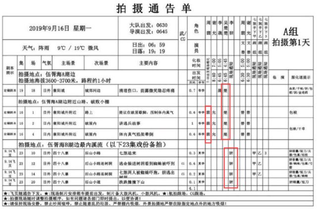 Đây là chi tiết quay phim ngày 16 tháng 9, theo đó, Triệu Lệ Dĩnh có 3 cảnh quay, Trương Huệ Văn có 3 cảnh quay, Chu Khiết Quỳnh có 4 cảnh quay.