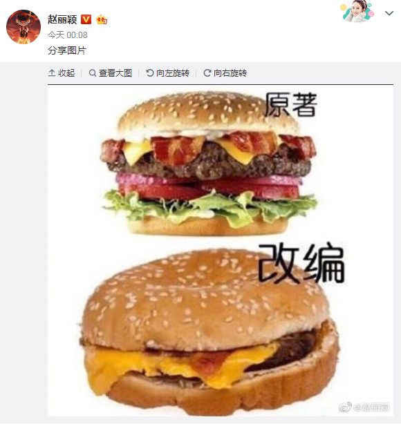 Người thông minh chắc chắn đều nhìn ra được hàm ý của Triệu Lệ Dĩnh, nguyên tác giống như chiếc bánh sandwich vừa có đầy đủ rau thịt vô cùng bắt mắt, nhưng sau khi cải biên thì người nhìn không còn muốn ăn nữa, bởi rau thịt đều không còn, cảm giác giống như một sự lừa dối.