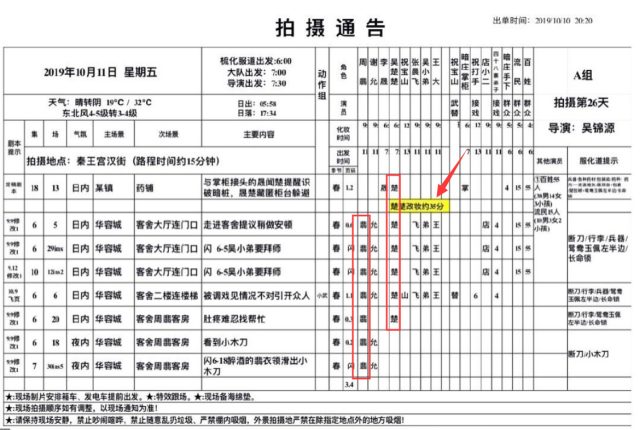 Trên bảng thông báo ngày 2 tháng 10, Triệu Lệ Dĩnh có 6 cảnh quay, vai Ngô Sở Sở của Trương Huệ Văn có 4 cảnh quay, Chu Khiết Quỳnh cũng có 4 cảnh quay.