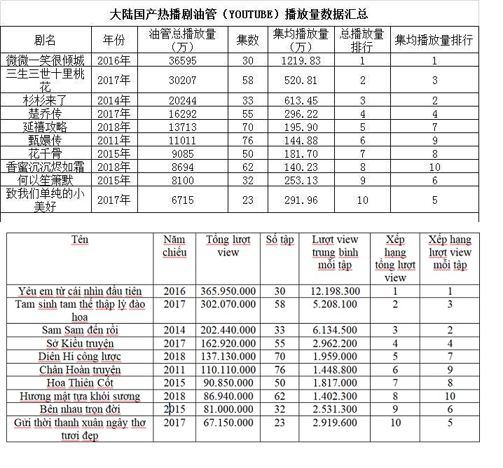 Mới đây, thành tích lượt xem các bộ phim truyền hình Trung Quốc đã được tổng hợp và sắp xếp thành danh sách những bộ phim Trung Quốc có lượt xem cao nhất trên Youtube. Trong danh sách đều là những cái tên quen thuộc, là những bộ phim từng làm mưa làm gió một thời trên màn ảnh xứ Trung cũng như nhiều nước trong khu vực châu Á như Yêu em từ cái nhìn đầu tiên, Tam sinh tam thế: Thập lý đào hoa, Sam Sam đến rồi, Chân Hoàn truyện, Hoa Thiên Cốt…
