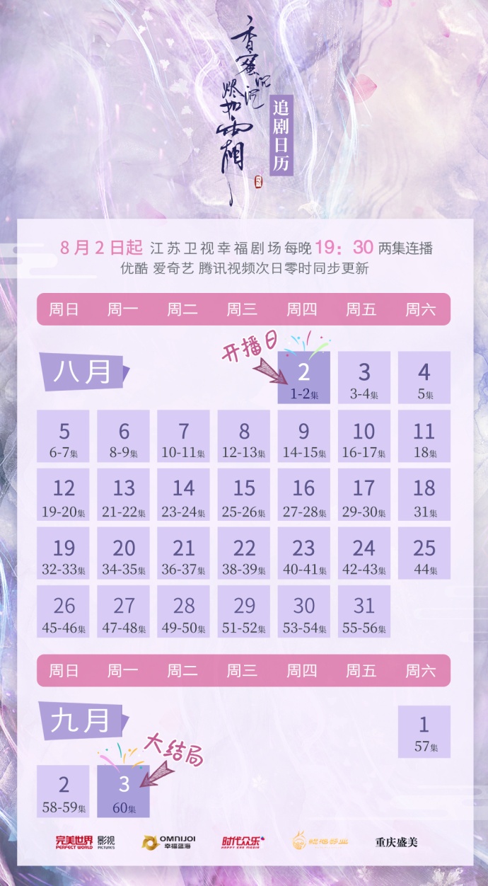 Hiện tại, Hương mật tựa khói sương được phát sóng trên đài Giang Tô, mỗi ngày 2 tập vào lúc 18h30 giờ Việt Nam, thứ 7 chỉ chiếu một tập.