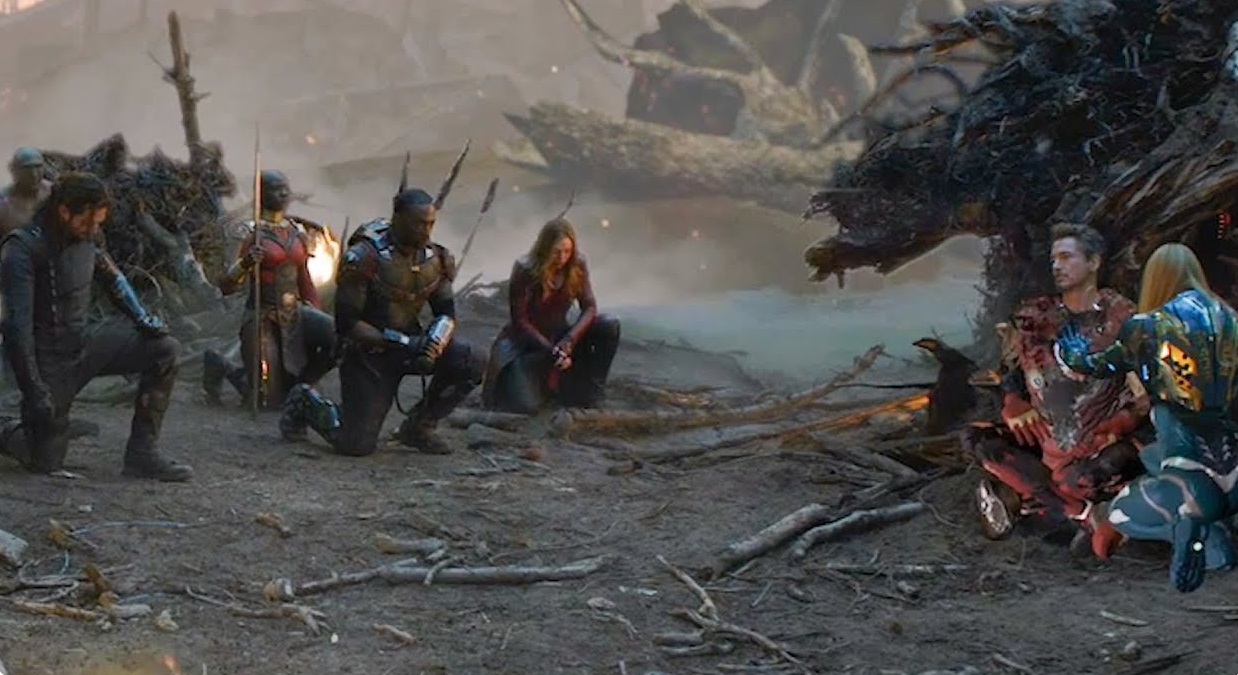 Cảnh các siêu anh hùng quỳ gối trước thi thể Iron Man.