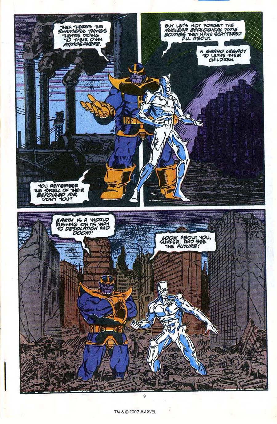 Tất nhiên Silver Surfer hoàn toàn không chấp nhận quan điểm của Thanos khi “vơ đũa cả nắm” như vậy và khẳng định rằng sẽ có người quan tâm, có những người muốn bảo vệ tương lai. Tiếp tục như vậy, Thanos chỉ ra rằng chỉ có cách tiêu diệt đi một lượng lớn dân số mới có thể bảo vệ sự bình yên, ổn định của vũ trụ và khẳng định rằng Death là người cử hắn ta thực hiện nhiệm vụ này hay chí ít là hắn tự huyễn hoặc mình thế. Nhưng xét cho cùng đây vẫn là tội diệt chủng ở cấp vũ trụ, một hành động của một tên bạo chúa mà thôi.