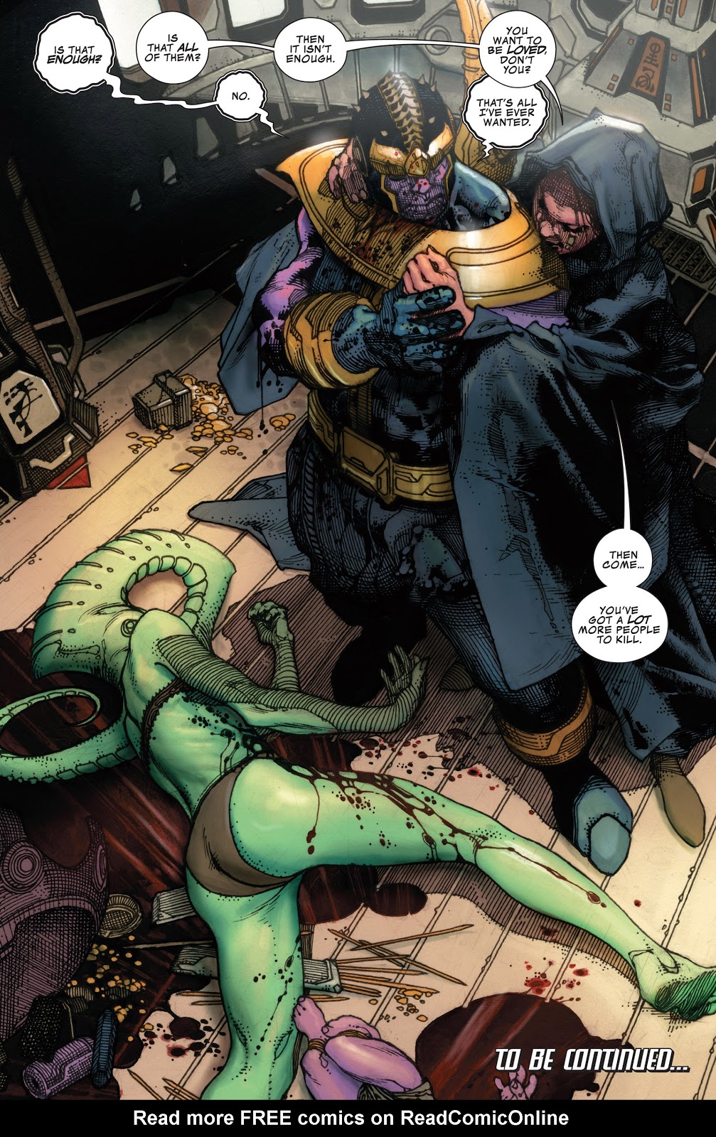 Thanos bắt đầu cuộc thảm sát ở rất nhiều hành tinh trong vũ trụ và luôn thấy rằng dù có giết bao nhiêu nữa vẫn không bao giờ là đủ. Hắn sớm nhận ra rằng người tình bấy lâu nay của hắn là Death - cái chết, thứ duy nhất mà hắn yêu thích từ khi được sinh ra và ả chỉ có thể bị nhìn thấy bởi mình hắn. Thanos cùng Death tới Titan hủy diệt tất cả chỉ để lại A’Lars - cha của hắn được sống để chứng kiến Thanos tiêu diệt hết mọi thứ. Tại đây A’Lars đã chỉ ra rằng không có ai trên Titan nữa, chỉ còn ông và hắn. Death luôn là một phần tưởng tượng của Thanos mà thôi, hắn chưa bao giờ thực sự yêu ai trừ chính bản thân mình. Và cuối cùng, khi Thanos lần đầu hôn Death, hắn cảm thấy thật lạnh lẽo.