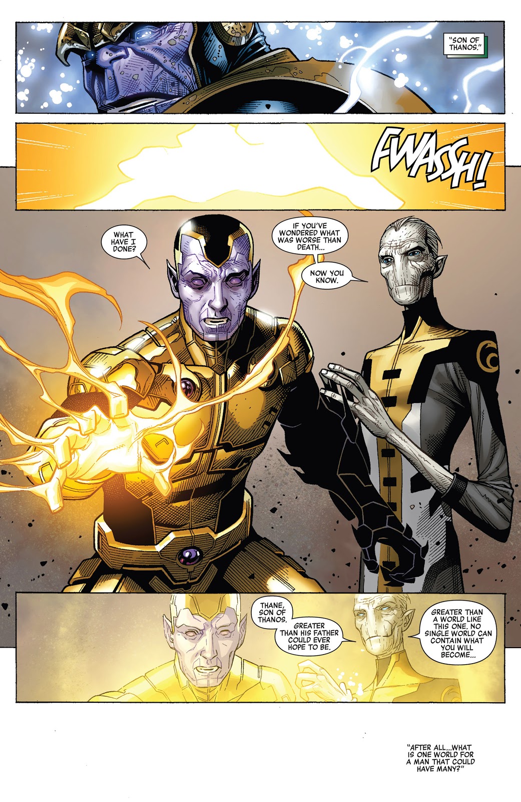 Sau đó, Corvus Glaive đã tới Attilan - vương quốc của các Inhuman để yêu cầu vật hiến dâng từ vị vua của Inhuman - Black Bolt. Tất nhiên, Corvus Glaive đã sớm bị từ chối khiến Thanos phải tự thân mình tới Attilan để đưa ra lựa chọn cho Black Bolt: Giao con trai Thanos ra hoặc Attilan cùng các Inhuman sẽ bị hủy diệt bởi bàn tay của Thanos. Black Bolt hét thẳng vào mặt Thanos, hủy diệt Attilan đồng thời kích hoạt Terrigen Bomb trên toàn cầu. Thanos giận dữ đánh bại Black Bolt nhưng không nhận ra rằng, hắn chính là nguyên nhân khiến Thane hoàn toàn trở thành một Inhuman sau khi tiếp xúc Terrigenesis.