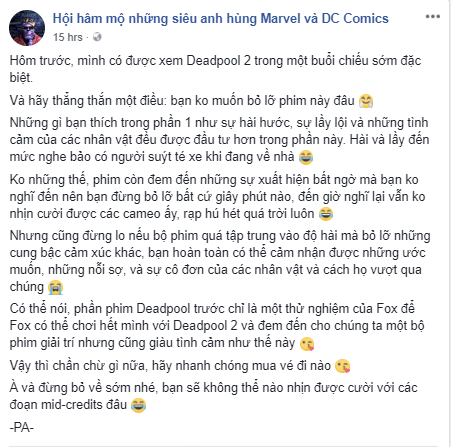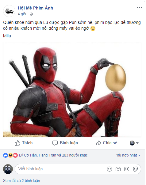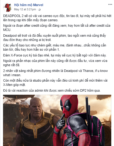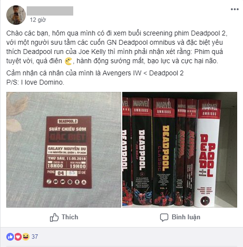 Phải đến ngày 18/05/2018, Deadpool 2 mới chính thức trở lại trên toàn thế giới với những pha trêu chọc mang đậm dấu ấn của mình. Tuy nhiên vào ngày 11/05 vừa qua tại Việt Nam, một buổi trình chiếu đặc biệt dành riêng cho các fan của nhân vật này đã diễn ra với số lượng hạn chế. Kết thúc buổi chiếu đặc biệt, các khán giả đầu tiên đều dành tặng những lời khen ngợi tuyệt vời cho bộ phim. Mọi người đều có chung nhận xét rằng Deadpool 2 hơn hẳn phần đầu tiên về độ hài hước và hành động.
