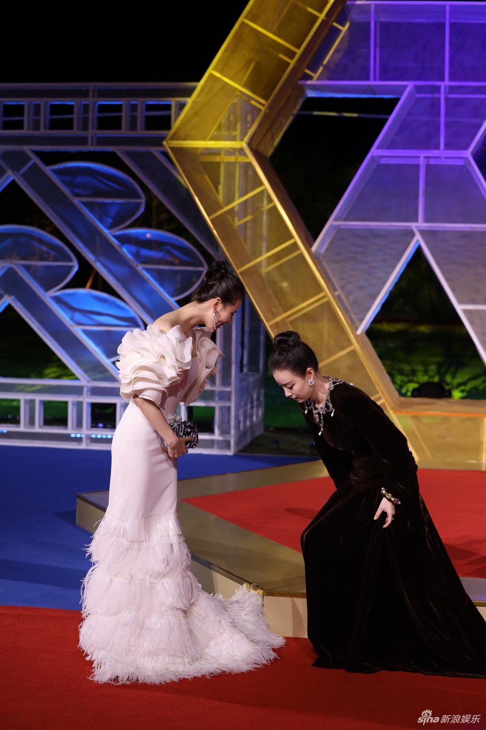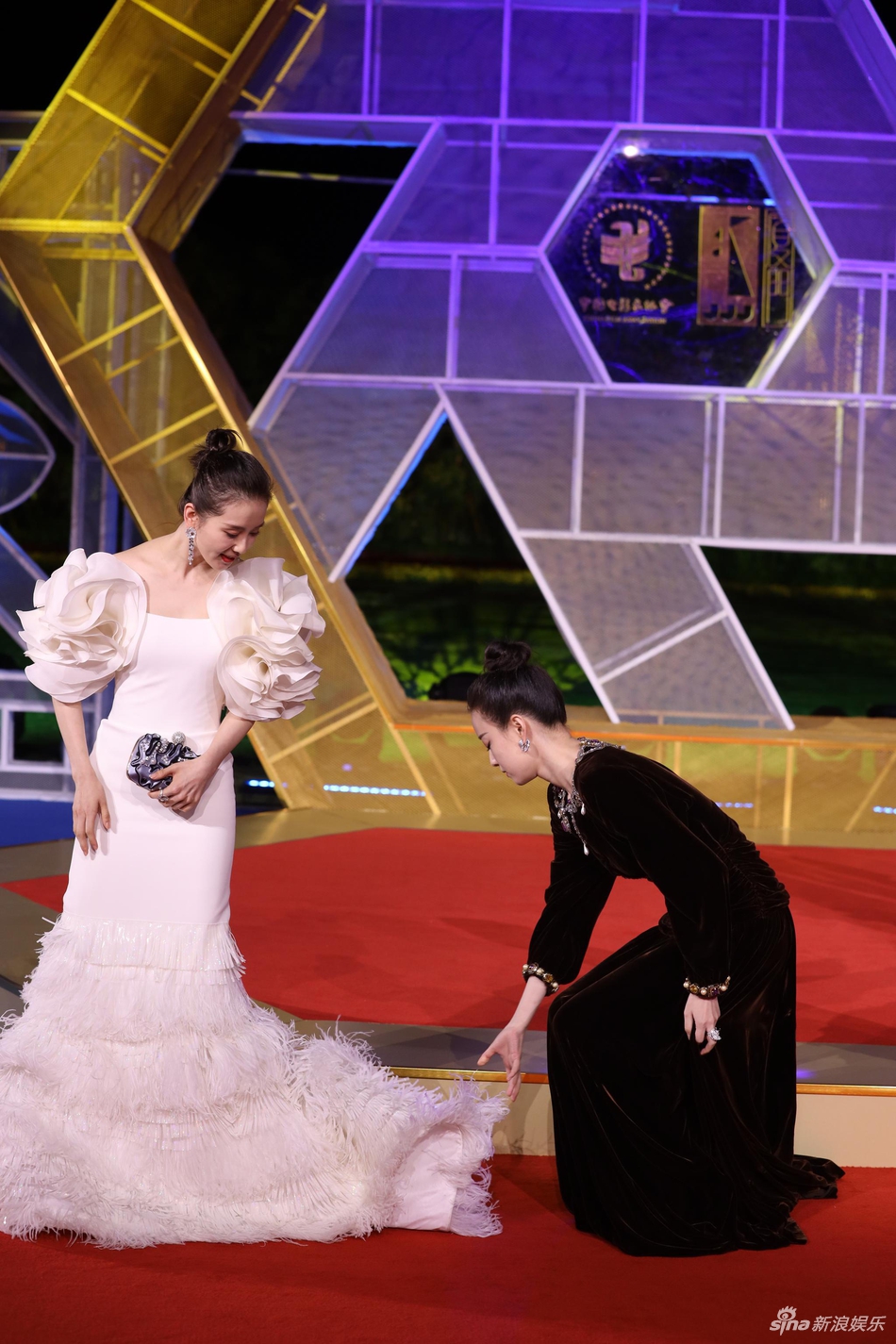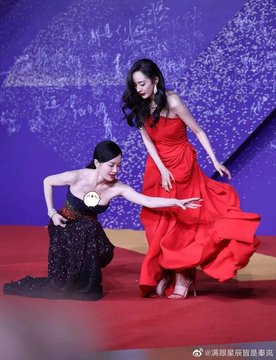 Trong đoạn phát sóng trực tuyến, nữ diễn viên Tần Lam với bộ trang phục đầy màu sắc lấp lánh đã lộ ra nét khẩn trương trên gương mặt. Có lẽ vì thế mà Dương Mịch đã cùng nắm tay đồng nghiệp cùng tiến đến thảm đỏ. Sau đó, Tần Lam đã giúp Dương Mịch chỉnh sửa lại váy dài ngay trên thảm đỏ.