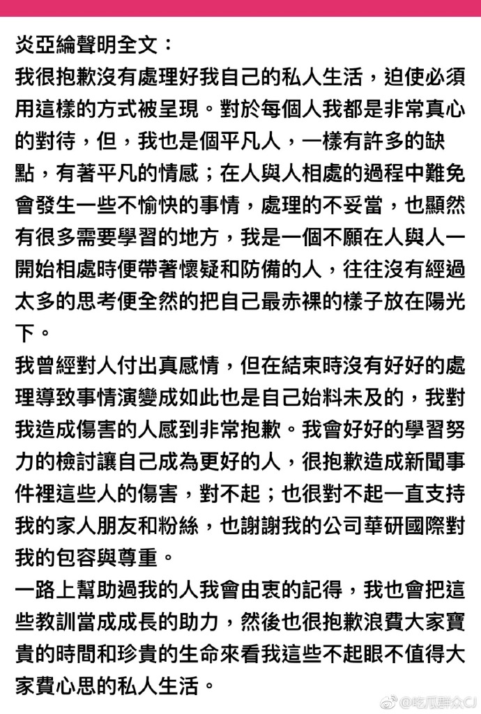 Chuyện đến nước này, Viêm Á Luân cũng đã thừa nhận lỗi lầm của mình, đồng thời từ nay về sau sẽ cố gắng trở thành một người tốt hơn, cảm thấy bản thân cũng là người bình thường, cũng sẽ có khuyết điểm, kinh nghiệm xử lý trong chuyện tình cảm không nhiều, bản thân là một người không hề có tính nghi ngờ và phòng bị, luôn mở lòng trước bạn bè, không hề giấu diếm gì cả.