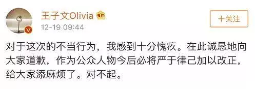Dưới sự phê bình của dư luận, Vương Tử Văn lên tiếng xin lỗi trên weibo: “Đối với hành vi không thỏa đáng lần này, tôi cảm thấy vô cùng hổ thẹn. Ở đây, tôi thành khẩn gởi lời xin lỗi đến mọi người, vốn là nhân vật của công chúng, hôm nay và sau này tôi sẽ càng nghiêm khắc với bản thân hơn. Đã mang thêm phiền phức cho mọi người rồi. Xin lỗi!”.
