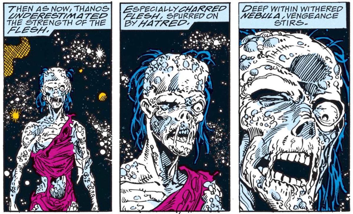 Nebula là người đáng thương nhất trong tất cả những đứa con nuôi của Thanos khi mà cả gia đình của cô bị tên đại ma đầu này giết sạch, sau đó còn biến cả cơ thể Nebula thành máy móc. Trong nguyên tác truyện tranh, Nebula còn thảm hơn khi bị Thanos biến thành một xác sống có ý thức.