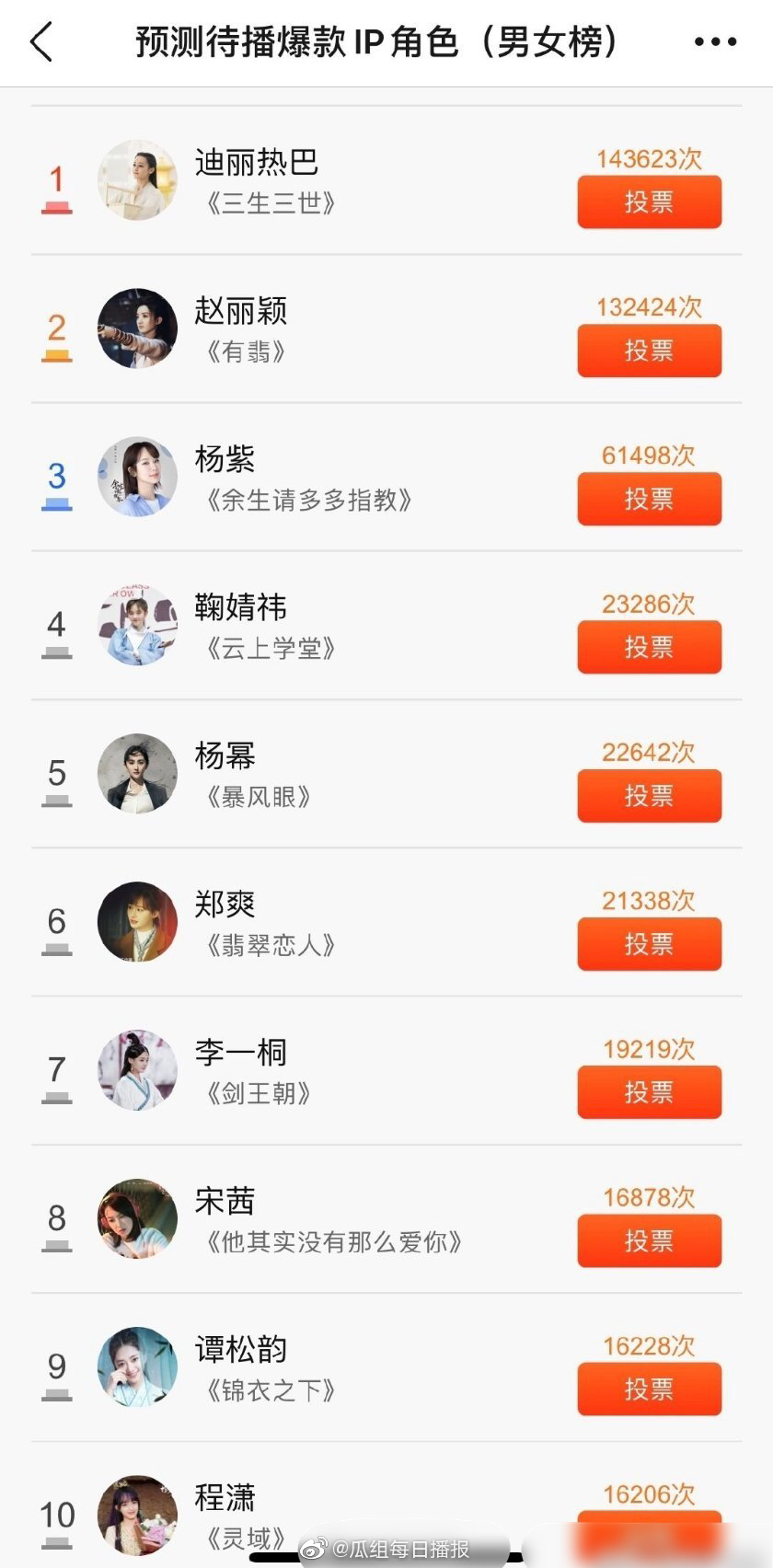 Về phía bảng nữ có những cái tên đáng chú ý như Địch Lệ Nhiệt Ba, Dương Tử, Dương Mịch, Triệu Lệ Dĩnh…
