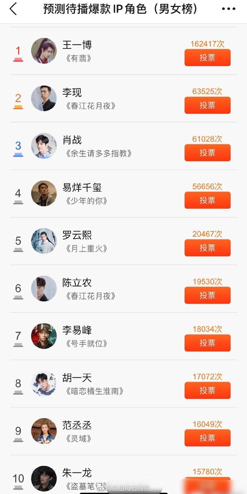 Về phía bảng nam có những cái tên đáng chú ý như Lý Hiện, Vương Nhất Bác, Tiêu Chiến…