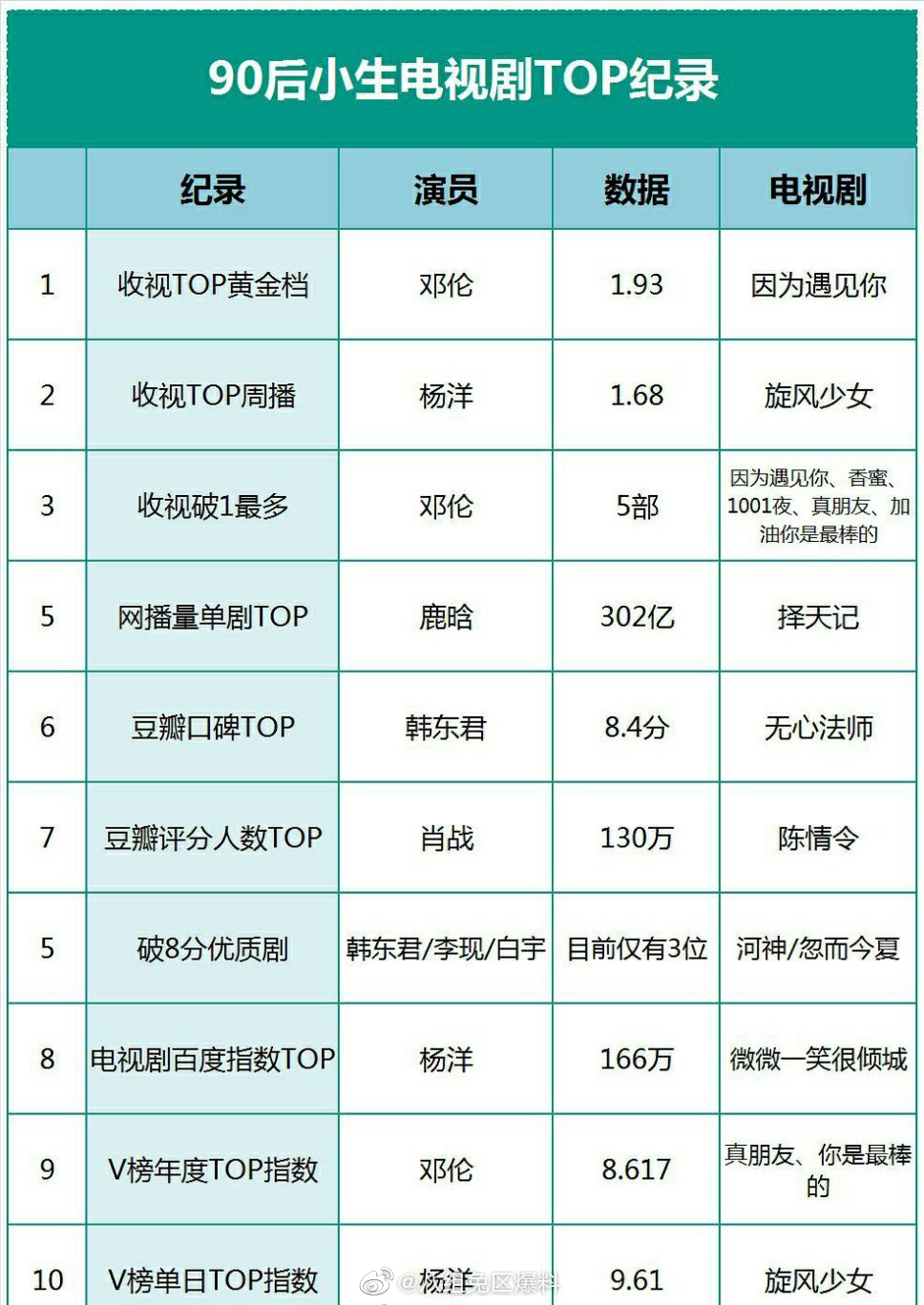 Gần đây, dân mạng Trung Quốc đã tổng kết bảng thành tích tiểu sinh sau 90 (không bao gồm sau 95 nên Vương Nhất Bác, Lưu Hạo Nhiên, Vương Tuấn Khải, Ngô Lỗi… không có trong danh sách này). Bảng thống kê kỷ lục về các Top phim truyền hình của những nam thần sau 9X, trong đó có sự góp mặt của lưu lượng nổi tiếng như Dương Dương, Tiêu Chiến, Lộc Hàm, Đặng Luân…