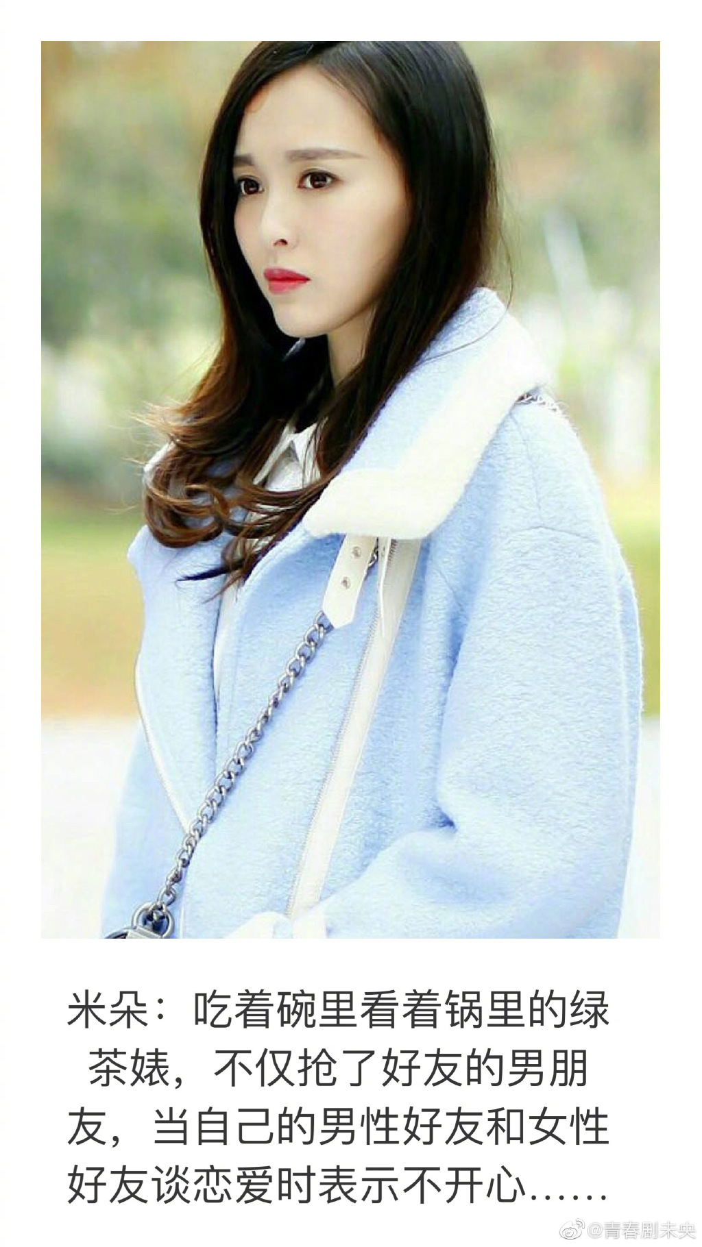 Mễ Đóa (phim Người tình kim cương): Bên ngoài thanh thuần bên trong tâm kế, ăn trong bát nhìn trong nồi, không chỉ cướp người yêu của bạn thân mà khi nhìn hai người bạn thân của mình yêu nhau thì tỏ ra không vui.