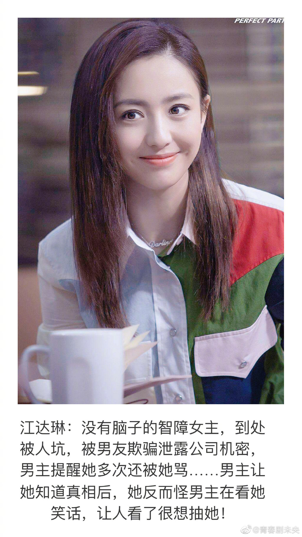 Giang Đạt Lâm (phim Quan hệ hoàn mỹ): Một nữ chính não tàn, đi đâu cũng bị người ta hại, bị bạn trai lừa tiết lộ cơ mật công ty, nam chính nhiều lần nhắc nhở nhưng lại bị cô ta mắng… Khi nam chính cho cô ta biết chân tướng, cô ta ngược lại còn trách nam chính.