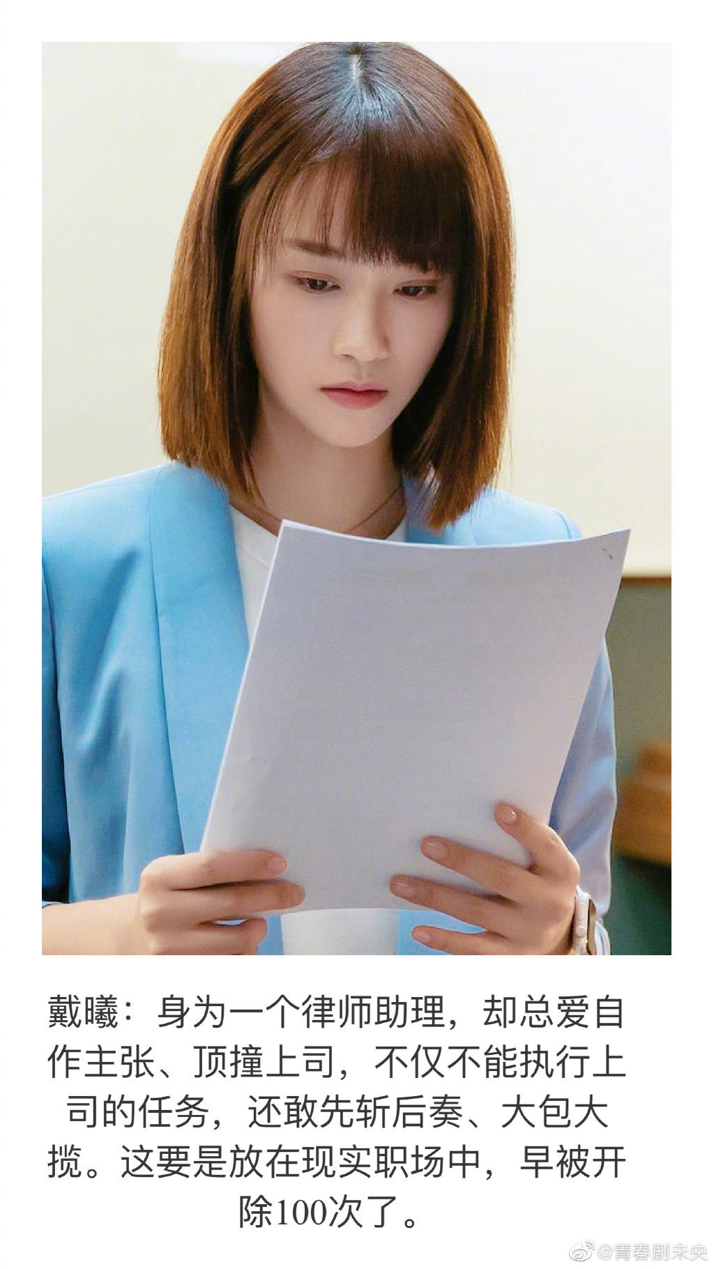 Đới Hi (phim Luật sư tinh anh): Là một trợ lý luật sư nhưng lại luôn tự mình làm chủ, xung đột với sếp, không chỉ không thực hiện nhiệm vụ sếp giao mà còn tiền trảm hậu tấu, thích ôm việc vào người. Nếu điều này xảy ra trong thực tế thì sớm đã bị đuổi việc 100 lần rồi.