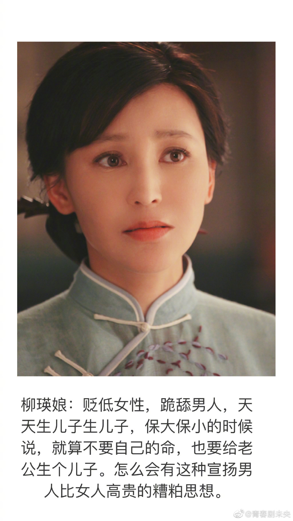 Liễu Anh Nương (phim Nương đạo): Coi thường phụ nữ, quỳ gối trước đàn ông, ngày ngày chỉ nói mỗi chuyện sinh con trai. Khi sinh con còn nói phải sinh cho chồng con trai mặc kệ tính mạng của mình. Kiểu trọng nam khinh nữ như thế thì làm sao có thể coi là tư tưởng cao quý cho được.