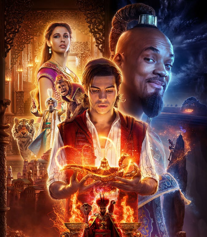 Không phải tất cả mọi chuyện xảy ra đều giống nhau, một cách tự nhiên. Ở phiên bản này, Thần Đèn đã có một chuyện tình với con người - cô hầu gái của công chúa Jasmine (Nasim Pedrad), người mà anh ta theo đuổi trong khi Aladdin và Jasmine đang chơi đùa cùng tấm thảm ma thuật của họ. Nhân vật phản diện Jafar (Marwen Kenzari) được phác họa như một hình ảnh phản chiếu xoắn của Aladdin, anh đã từng là một con chuột đường phố. (Phiên bản này của Jafar phần lớn không hài hước và không có cá tính, nhưng sự lựa chọn biến anh ta thành một con chuột đường phố trong quá khứ là một trong những ý tưởng hấp dẫn của bộ phim.) Và bây giờ Jasmine có tham vọng trở thành Quốc vương tiếp theo, không chỉ kết hôn cho tình yêu.