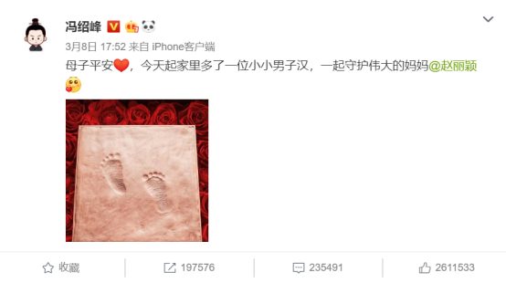 Ngày 9 tháng 3 năm 2019, Phùng Thiệu Phong đã đăng tải hình dấu chân của con trai trên mạng xã hội, tuyên bố Triệu Lệ Dĩnh thuận lợi hạ sinh con trai đầu lòng, cùng với bà xã từ thế giới ngọt ngào của hai người trở thành một nhà ba người đầy hạnh phúc. Từ đó về sau, Triệu Lệ Dĩnh không hề xuất hiện làm việc, luôn ở trạng thái 'đình công'. Việc bảo mật thông tin về con trai của cặp đôi cũng vô cùng tốt, khi ngoại trừ lần bị chụp được ở bệnh viện, gần như không có bất kỳ thông tin nào khác.