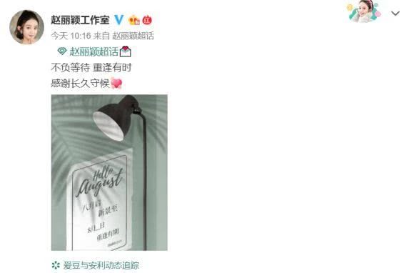 Ngày 1 tháng 8, phòng làm việc Triệu Lệ Dĩnh đã chia sẻ tấm hình lên mạng xã hội weibo. Trong bức hình có viết: “Bắt đầu tháng 8 với phong cảnh mới. Ngày 1 tháng 8, ngày trùng phùng” kèm theo status: “Không phụ sự chờ đợi, có lúc gặp lại, cảm ơn đã chờ đợi rất lâu“. Đây là động thái chính thức tuyên bố của phòng làm việc khi thông báo tháng 8 Triệu Lệ Dĩnh sẽ chính thức trở lại ngành giải trí.