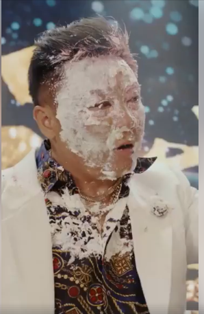 Hầu Tứ Hải ăn bánh kem bằng mặt.