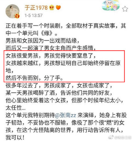Vu Chính - nhà biên tập vàng của làng phim ảnh Hoa ngữ không chỉ giúp cho khán giả “nhiều chuyện” mà còn lợi dụng những chuyện này để cư dân mạng thảo luận và đẩy tác phẩm phim ảnh của mình trở nên nổi tiếng. Gần đây (05/01), Vu Chính đã đăng tải một bài viết trên Weibo, nói rằng sắp đến sẽ quay phim tình yêu được chuyển thể từ người thật việc thật. Tuy nhiên sau đó không lâu, Vu Chính đã xóa bài viết. Chính vì hành động này mà dân mạng càng tò mò hơn.